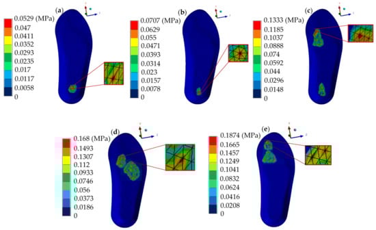 von Mises stress in the plantar region of the patient-specific insole for all stance phases. (a) Heel strike. (b) Loading response. (c) Mid-stance. (d) Heel rise. (e) Pre-swing.