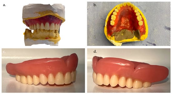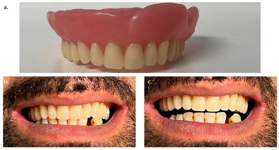 The fabrication of mobile dentures following dental extractions is a cornerstone in prosthodontic rehabilitation, aiming to restore masticatory function, esthetics, and overall quality of life [1]. Removable prosthodontics are a treatment option for patients who have lost one or more teeth. Fixed prosthodontics, such as bridges and crowns, are cemented or screwed to the patient’s existing teeth or dental implants, offering a non-removable solution that closely replicates the natural appearance and function genuine teeth. This approach ensures excellent stability and efficiency in chewing, contributing positively to oral health. However, fixed prosthodontics often require the alteration or preparation of adjacent healthy teeth, which can lead to potential long-term dental issues and necessitates a complex and rigorous maintenance regimen to prevent problems such as decay under the prosthetic or periodontal disease at the abutment sites. On the other hand, removable prosthodontics, like complete and partial dentures, provide a versatile and less invasive alternative that is generally more cost-effective and easier for patients to manage in daily cleaning and maintenance. Despite these benefits, they might lack the stability and comfort of fixed alternatives, as they can move during speech or eating, potentially leading to sore spots and diminished patient satisfaction. Removable options also typically require more frequent adjustments to accommodate changes in the oral cavity, adding to their long-term upkeep. Deciding between fixed and removable prosthodontics depends on several patient-specific factors, including the condition of remaining teeth, preference for permanence versus flexibility, esthetic considerations, and financial constraints. Each option presents unique advantages and challenges that should be carefully considered regarding the patient’s lifestyle, expectations, and overall oral health goals [2]. Removable prosthodontics are made of a base material, such as acrylic resin, that supports artificial teeth. Removable prosthodontics can be either complete or partial. Complete dentures replace all teeth in an arch, while partial dentures replace only some of the teeth. Manufacturing removable prosthodontics is a complex process involving several steps [3]. Traditional protocols for denture fabrication typically involve multiple clinical and laboratory steps, often extending over several weeks or even months. This time-consuming process can be a significant source of distress for patients, prolonging the adjustment and adaptation to the new prosthesis. In recent years, there has been a paradigm shift towards minimizing the number of clinical visits and reducing the overall treatment time without compromising the quality of the prosthodontic outcome [4,5].