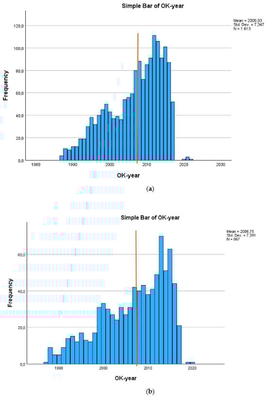 (a) Temporal trend for referral combined SAVR. The orange bar indicates the introduction of TAVI (OK-year refers to year of operation); (b) temporal trend for referral for isolated SAVR. The bar refers to the introduction of TAVI (OK-year refers to year of operation).