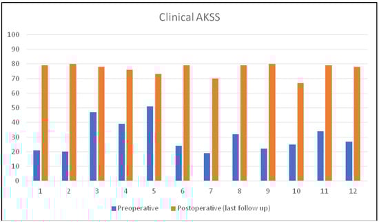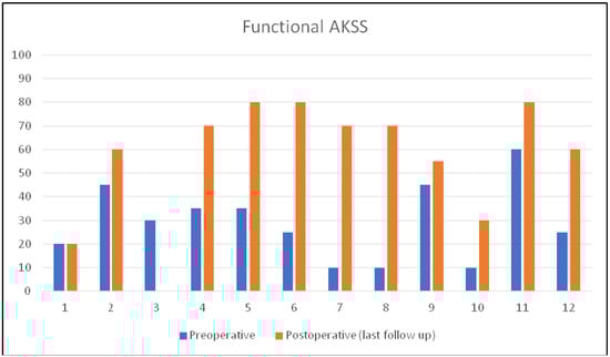 Overall, there was a significant improvement in mean AKSS. At the last follow-up, the average AKSS clinical score improved from 30.08 points preoperatively (range 19–51) to 78.83 points (range 67–80) (Figure 1), while the average AKSS function score improved from 29.17 (range 10–60) points to 56.25 points (range 0–80) (Figure 2).