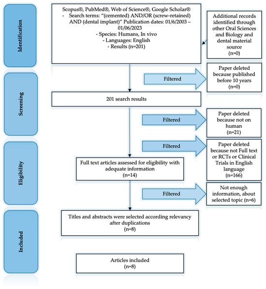 “(cemented) AND/OR (screw-retained) AND (dental implant)”.
