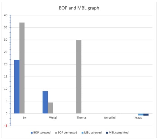 Weigl et al. [18] showed a higher value of BOP in cemented restoration (double) with higher plaque presence. According to the authors, the restoration type is independent of MBL. Patients reported higher satisfaction in both groups despite three technical failures in the screwed group and four in the cemented one. Kraus et al. [19], in their RCT, evaluated different biological, clinical, technical, and radiographical parameters. They did not record statistical differences between groups’ biological, technical, and radiographic outcomes. One merit to be reported in this context is that a cemented crown had to be removed because of peri-implant disease. Thoma et al. [20] showed minimal differences between their four examined groups except for one value, BOP. BOP was higher in the two cemented groups compared to the screwed ones. Descriptive and quantitative histological examination showed a higher inflammatory reaction in cemented groups with more inflammatory cells. Microbiological analysis showed similar values except for two species, Tannerella forsythia and Peptostreptococcus micros, found in the cemented groups with a higher count. Amorfini et al. [21] showed no prosthetic complications in both groups or significant differences in biological parameters such as PPD, mPI, BOP, or PES/WES. Still, there was some data to report about MBL and PI. MBL ranged between 0 and 1.75 mm in both groups; after ten years, the median value was 0.82 mm and 0.95 mm for screwed and cemented groups, respectively (in the Section 3, this manuscript reports erroneously published inverted data).