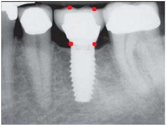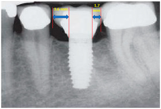 Representative periapical radiograph of implant and crown on implant in 3.6 using VistaSoft Dental® software (DÜRR DENTAL, Bietigheim-Bissingen, Germany) with mesial and distal marking points at boundary of implant platform and marginal ridge of crown.