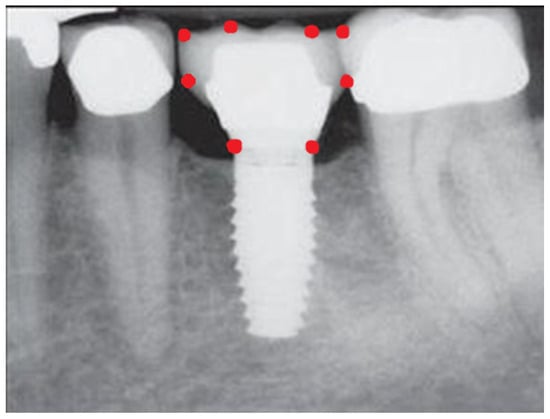 Representative periapical radiograph of implant and crown on implant in 3.6 using VistaSoft Dental® software (DÜRR DENTAL, Bietigheim-Bissingen, Germany) with mesial and distal marking points at boundary of implant platform and marginal ridge of crown and mesial and distal ends of restoration.