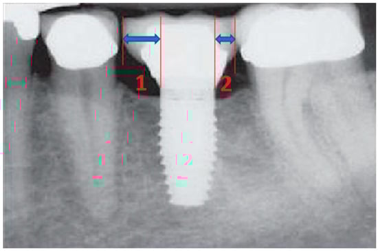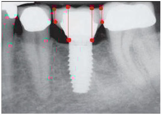 First, it was calibrated with the Parameters function of the VistaSoft Dental® software (DÜRR DENTAL, Bietigheim-Bissingen, Germany). The measurements of each calibrated radiograph for peri-implant bone loss were made by measuring the vertical distance from the implant neck to the BIC area, both mesially and distally, in microns (Figure 8), which allowed for the extrapolation of the loss from the BIC to the implant platform.