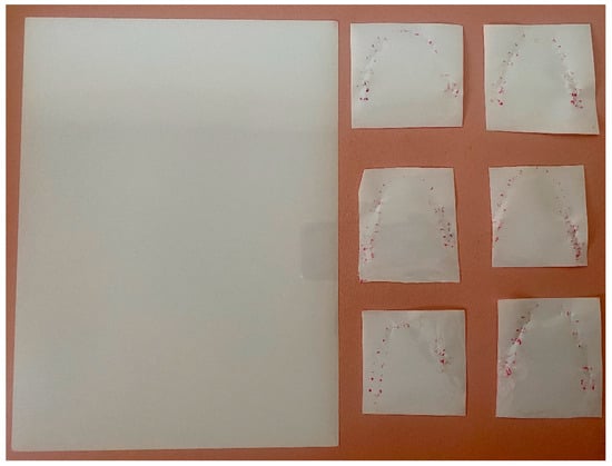 To study the effect of occlusal loading on peri-implant bone loss, each patient’s bite registrations were recorded on Medium MS PS 270 × 200 mm colorimetric sheets (PRESCALE® Fujifilm, Holdings Corporation, Tokio, Japan), which are 150 µm thick pressure-sensitive film sheets consisting of three layers of polyethylene terephthalate (PET), a developer layer, and a microcapsule layer [24]. The sheets were cut to the size of the patient’s arch, 6 × 8 cm, 7 × 8 cm, or a square of approximately 8 × 8 cm, with the shiny side facing the occlusal surface of the lower jaw and the satin side of the colorimetric sheet in contact with the occlusal surfaces of the upper jaw. Maximum intercuspal pressure was applied for three seconds to obtain an impression whose color intensity and distribution corresponded to the applied pressure and the contact area. The microcapsules release a dye in response to an applied pressure ranging from 10 to 120 MPa. During compression, the microcapsules collapse, leading to the mixing of the color former and the developing agent inside, resulting in a red color. These bite registration sheets were scanned, calibrated, and analyzed using PRESCALE® (Fujifilm, Tokyo, Japan) software FPD-8010E to determine the degree of coloration and the area of each occlusal contact point, excluding areas of red coloration that had probably been generated by forces other than occlusal contact (Figure 9).