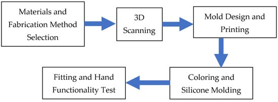 The overall process for creating a customized silicone prosthetic, as shown in Figure 1, begins with selecting materials and a fabrication method. The patient’s fingers are then 3D scanned, and these data are used to design and print an accurate mold. Silicone is then mixed with pigment color and casted on the printed mold that follows, where the mold is cast with RTV silicone mixed with pigments to match the patient’s skin tone. After curing, the prosthetic is removed and undergoes fitting and functionality testing to ensure that it meets the patient’s needs.