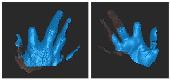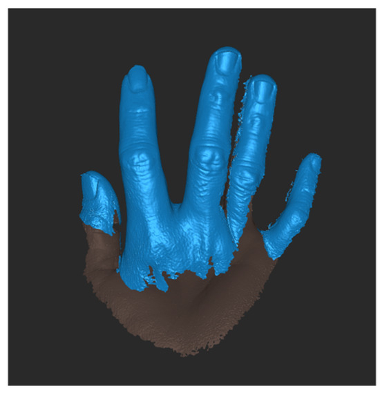 The patient’s right index finger is amputated from the proximal interphalangeal joint (PIP) to the tip, also known as the intermediate phalanges. Based on the patient’s experience and needs, they prefer a slightly bent prosthetic rather than a straight one for daily use. Therefore, we scanned the contralateral finger at a 15° angle. The 3D scan results of the patient’s severed hand are shown in Figure 2. The scan of the patient’s contralateral finger was then modified in Revo Scan 5 to clean, refine, and mirror the data, creating a usable 3D model for the prosthetic design, as illustrated in Figure 3.