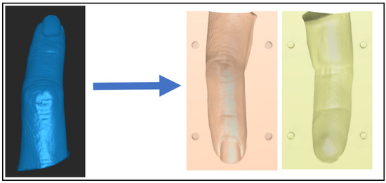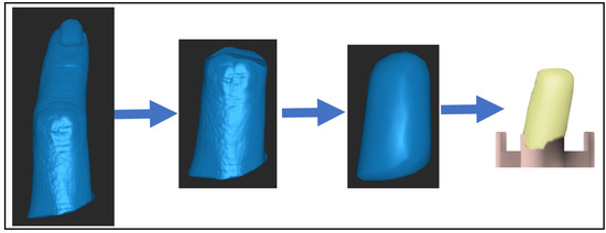 A certified prosthetist performs the traditional manufacturing process for custom static and passive prosthetic fingers, which includes at least two waxes [11] or alginate [12,13] impressions for the residual digit and the contralateral finger. To generate the final shape, a lost-wax process with dental stone is used with silicone molding. Although dental stone prostheses achieve remarkable anatomical accuracy [14], the construction procedure is time-consuming and expensive [15]. Another shortcoming for the traditional process such as plaster cast is that the skin topology mapping phases can be relatively invasive and uncomfortable for the patient [16].