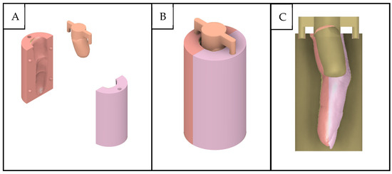 Exploded view of the mold design (A), final mold design (B), and section view of the mold (C).