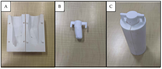 Two parts of 3D-printed outer molds (A), 3D-printed part of inner mold (B), and the assembled 3D-printed mold (C).