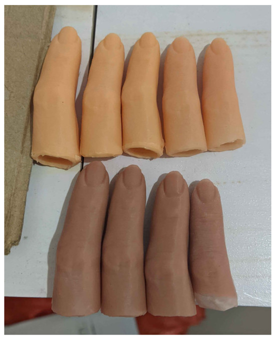 Silicone, on the other hand, is the common material choice for prostheses as it is not irritating to the skin, it is hypoallergenic, and can withstand long-term wear and everyday stretching, while being closer to the characteristics of human fingers. Silicone is difficult to directly 3D print; however, it could easily be molded to form various forms and sizes due to their diverse physical properties [29]. Furthermore, it is possible to add and mix dye to color silicones. However, the ability to 3D print silicone is not yet widely available. Alternatives such as TPU (Thermoplastic Polyurethane) can be 3D printed, and offer high elasticity and abrasion resistance, but they are more challenging to recolor and provide a less realistic look and texture compared to silicone-based products. Silicone is then a better choice, resulting in more natural aesthetics and better resistance for heat and chemical degradation that can be found in day-to-day life.