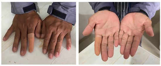 Various color compositions can be achieved by mixing basic silicone colorings by hand. A skin color chart guide by L’Oréal was used as a standard reference for matching patients’ skin color. For the study, the patient’s skin color was matched with the reference chart and then found by mixing basic coloring by hand until the dye was of a similar color to the reference picked out earlier. The coloring was mixed into the silicone mixture and poured into the mold to produce the prothesis. The finished prosthetics can be seen in Figure 8. The closest match to the patient’s skin on the color chart was B5 for the palmar side of the hand and C9 for the dorsal side. The resulting prosthesis notably matches the patient’s palmar skin tone as intended. However, the prosthesis only has one skin tone, while the patient has notably different skin tones between the palmar and dorsal sides, as shown in Figure 9. Further finishing techniques should be explored to be able to make the prosthesis have different color tones for each side, to achieve closer resemblance to the natural look.