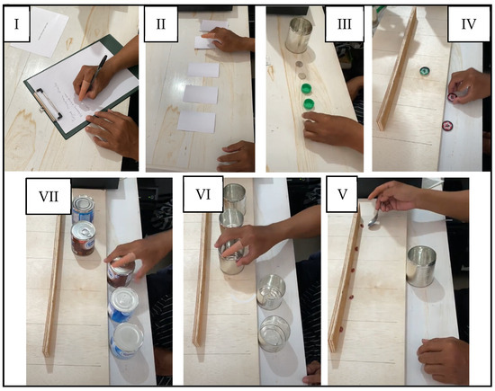 Jebsen test clockwise from top left for writing (I), flipping paper (II), picking up small object (III), stacking checkers (IV), simulated feeding (V), moving empty can (VI), and moving large weighted can (VII).