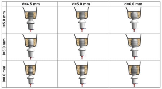 Nine different geometric designs of Bicon Integra-CP™ implants (Bicon, Boston, MA, USA) were investigated, varying in length (5.0 mm for S, 6.0 mm for I, and 8.0 mm for L) and diameter (4.5 mm for N, 5.0 mm for M, and 6.0 mm for W). To model these implants and abutments, their dimensions and designs were obtained using digital calipers, photographs, and images captured with a light optic microscope.