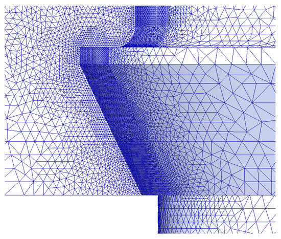 The mesh refinement process involved gradually reducing the element sizing from 2.0 mm to 0.010 mm, and the change in the maximum first principal strain in the bone–implant interface was studied. The maximum strain converged toward a finite value as the mesh density increased, with a convergence criterion set to less than 2% for the changes in the maximal strain of all the elements [31,32]. The analysis was stopped at the FEA size of 0.020 mm. The total number of 3D finite elements ranged from 1,659,134 to 2,000,652, and the nodes ranged from 2,238,052 to 2,695,410. An example of FE meshing for a 5.0 × 5.0 mm implant is provided in Figure 3.