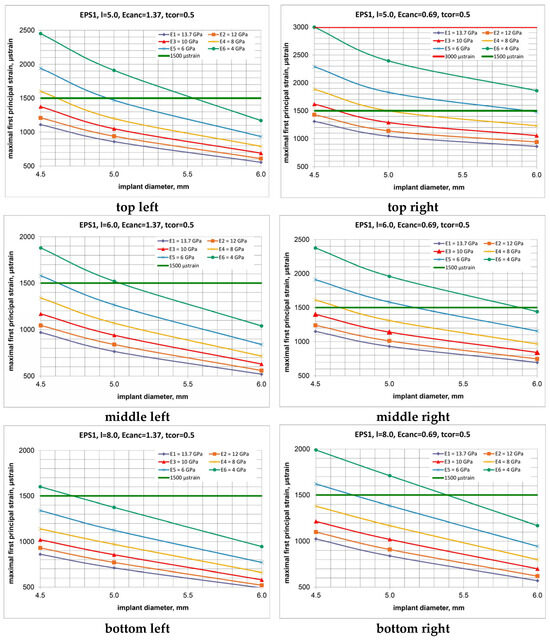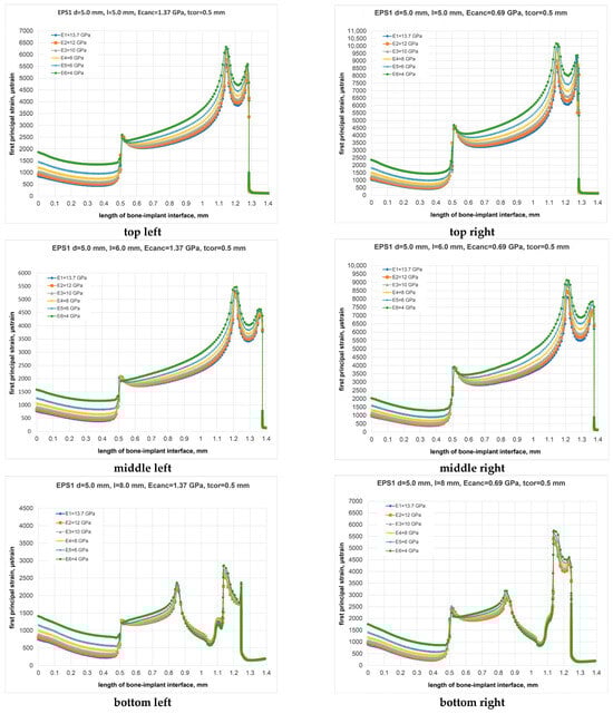 Illustration of first principal strain distribution along the critical line of bone–implant interface for 5.0 × 5.0 mm (top), 5.0 × 6.0 mm (middle), 5.0 × 8.0 mm (bottom) implants placed into bone segments of types III (left) and IV (right) bone (EIII = 1.37 GPa and EIV = 0.69 GPa) at E1–E6 degrees of cortical bone elasticity.