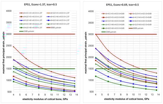 Dependence of maximal first principal strains (MFPSs) in cortical bone on its modulus of elasticity for the spectrum of implants placed into bone segments with 0.5 mm cortical bone thickness for type III (left) and IV (right) bone and the studied degrees of patient-specific cortical bone elasticity E1–E6. Red line corresponds to 3000 microstrain of Frost “minimum effective strain pathological” (MESp).