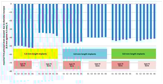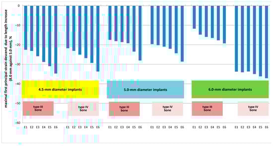 Maximal first principal strain (MFPS) reduction due to the implants’ length increase from 4.5 mm to 6.0 mm for the spectrum of implants placed into bone segments of types III and IV bone.