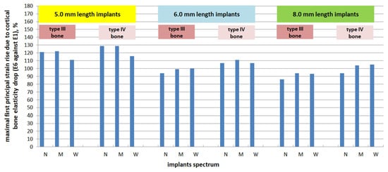 A reduction in cortical bone elasticity caused its significant overstrain: for N-, M-, W- implants, the MFPS rise due to decrease in cortical bone rigidity (E6 against E1) for type III bone was 121/122/111, 94/99/101, and 86/94/93% (S-/I-/L-implants). For type IV bone, cortical bone and implant parameters, the MFPS rise was 129/129/116, 107/110/107, and 94/104/105% (S-/I-/L-implants). The results of an MFPS rise (percentage) are illustrated in Figure 13.