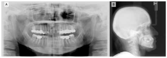 Radiographs taken before orthodontic treatment: (A) orthopantomography (OPG) taken during the initial visit and (B) a lateral cephalometric radiograph before the start of treatment.