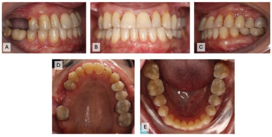 Intraoral photographs after caries and periodontal clearance with M-PCA cemented to abutment teeth: (A) right occlusion; (B) front occlusion; (C) left occlusion; (D) maxillary occlusion; (E) mandibular occlusion.