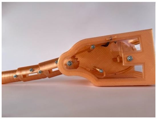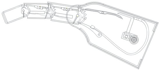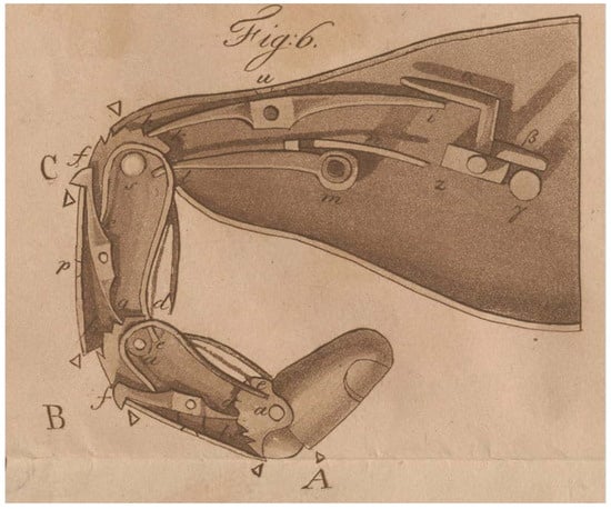A second iron hand was developed some years later, in which the fingers could be passively moved in all joints. In 1815, the Basel-born copper engraver Christian von Mechel (1737–1817) illustrated and described the second iron hand and its sophisticated mechanics in a short book of 10 pages, containing two useful aquatint etchings of the hand prosthesis at a scale of 1:1 [2] (see Figure 1, Figure 2 and Figure 3). Mechel was given permission by the von Berlichingen family to dismantle the hand for this purpose. Recently, a first draft 3D-CAD reconstruction of the finger mechanics of the second iron hand based on the Mechel drawings was published [3]. However, upon printing the parts with a high-end multi-material polymer printer, the levers and springs of the finger mechanism broke after only a few movements. Furthermore, the Mechel publication did not explain every detail of the hand and is not quite 1:1 in scale, as a result of which the components were not correctly matched.