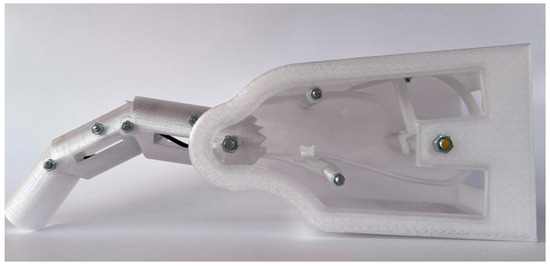 The dimensions of the components were correct in each case, but the function could not be guaranteed in the complete replica. If only the proximal phalanx is assembled with the medial phalanx, the spring of the medial phalanx can exert the necessary force to bring the engaged distal phalanx back into the starting position (extension position). However, as soon as the proximal phalanx is attached and the spring of this phalanx presses on the spring of the medial phalanx, the mechanism starts blocking. This is probably due to the excessive pressure exerted on the spring of the medial phalanx from the proximal phalanx, which means that it can no longer expand sufficiently, and the mechanism is blocked. Applying more force by thickening the spring did not solve this problem, as the spring became too rigid. This indicates that PETG is not a suitable material for the spring.