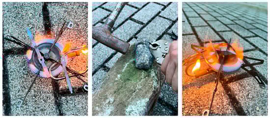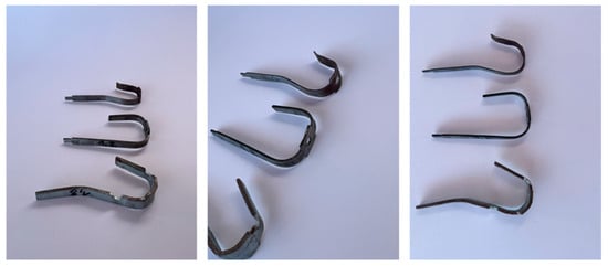 In the first test, an existing carbon steel with a thickness of 1.8 mm was used. While forming the 1.8 mm thick steel, it was realized that it was not suitable for use as a spring, as it was far too unruly. Two thinner steel sheets were therefore procured, which were 1.2 mm and 0.75 mm thick. These two springs were also heated and then forged with a hammer (see Figure 14). The spring made from the 1.2 mm wide steel was similar to the 1.8 mm string, too stiff, whereas the 0.75 mm wide spring mimicked the function of a spring very well. As soon as some pressure was applied from above, it expanded slightly in width and returned to its original shape as soon as it was released. Figure 15 presents the three results.