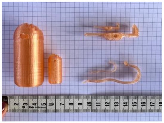 Finally, the distal phalanx, the spring, and the locking lever of the medial phalanx were scaled to a scale of 1:1. Figure 16 shows a comparison between the 2:1 and 1:1 scale. At the 1:1 scale, the outer wall of the phalanx was 1 mm thick, as was probably also the case with the original second iron hand. Despite the scaling, the link was very stable and could function as such. The inner mechanical parts, however, were very unstable at this scale. Although the spring withstood light pressure and returned to its original shape, it was too weak. The locking lever also appeared stable at first glance, but would probably break after force were applied several times. This means that the 3D-printed reconstruction worked at a scale of 2:1, but unfortunately, it was not possible to create a reliable model at a scale of 1:1 by using 3D printing.