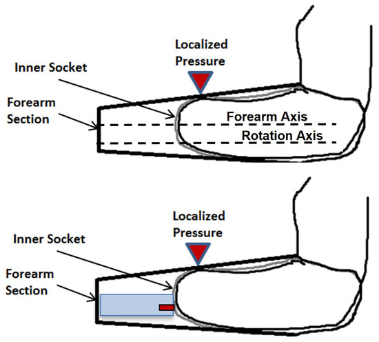 Localized pressure when elbow is flexed (top). Sleeve bearing placed on rotation axis reduces localized pressure (bottom).