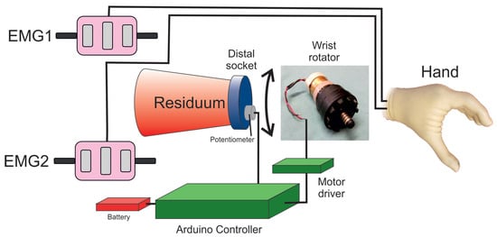 The system schematic is shown Figure 5. As the aim of the study was to assess the socket design, the electronics used many standard components as practical to make the comparison with his routine prosthesis simpler. The hand was controlled with standard prosthetic electrodes and the conventional two-input analog controller within the hand (Motion hand—Fillauer). The changes in voltage were used to signal the wrist unit to rotate in the clockwise or anticlockwise direction. The control of the wrist rotation was similar to the myoelectric control of a prosthetic axis. Two inputs (forearm pro/supination, flex/extension for the hand) are used to set the direction of motion with a dead-band in the middle set to prevent wrist (or hand) movement on small or noise voltages. The commercial hand used the controller built into it. For the wrist, the pro/supination was realized using an Arduino Uno (https://www.arduino.cc/ (accessed on 13 March 2025)). This simple control format was well within the capabilities of the microcontroller.