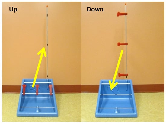Refined Clothespin Relocation Task—Subjects move three pins between the horizontal bar and the vertical bar. As the pins need to be rotated through ninety degrees, any compensations by the subject are apparent to the observer as well as the subject. The test is conducted in two directions from the horizontal bar to the vertical (up) and vice versa (down), shown by the arrows.