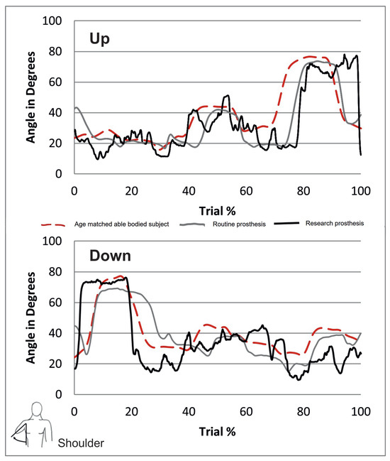 Figure 8 shows the time normalized trajectory of the shoulder angle for the upward and downward assessment in three cases. The trajectory represents the physical three-dimensional angle between reflective markers at the lateral epicondyle, the acromion process, and a marker on the right hip on the subject’s right side. The user’s current device, the research prosthesis, and a typical able-bodied subject’s trajectory (age and gender matched) are shown by the grey, black and red trajectory lines. To facilitate comparisons between different trials, the horizontal axis was normalized between 0% (start) and 100% (end task) when the subject pressed the timer button [28,29]. The trajectories are fit to a cubic spline with 400 data points.