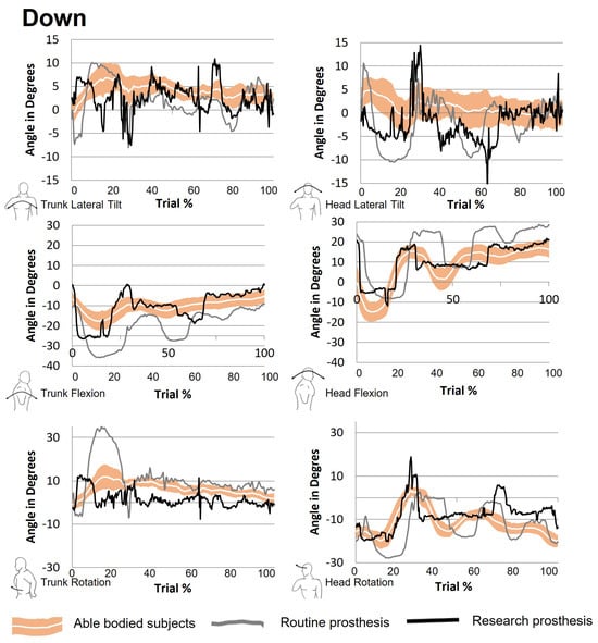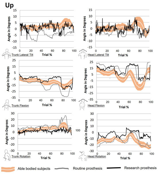 Figure 9 and Figure 10 show the trunk and head motions (lateral tilt, flexion, rotation) during the upward and downward assessments. The able-bodied group is displayed as an averaged trajectory within the shaded boundary (95% confidence interval). The routine device trajectory is shown in grey and the research prosthesis is shown in black.