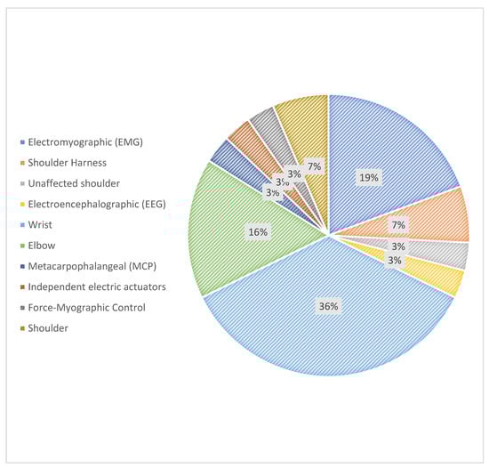 Regarding other control methods, six prostheses use electromyographic (EMG) signals, while unique approaches include the integration of electroencephalographic (EEG) control in the Cyborg Beast forearm and force-myographic control (FMG) featured in the Federica hand. Interestingly, no voice-controlled prostheses were identified in this review. Figure 2 provides a visual breakdown of the control mechanisms used in 3D-printed prostheses.