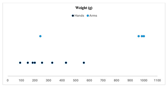 On average, hand prostheses, including their actuation systems, weighed 274 g, whereas arm prostheses had a higher mean weight of 797 g. Adult arm models ranged from 962 g to 1000 g. Actuation systems alone accounted for weights between 675 g and 695 g, significantly outweighing the less than 300 g attributed to the 3D-printed components. This indicates that the printed elements contribute minimally to the overall weight of these prostheses. Figure 3 illustrates the weight distribution of 3D-printed prostheses.