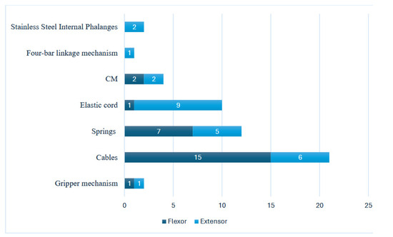 Extensor and flexor mechanisms were described in 26 out of the 35 articles reviewed. Non elastic, generally nylon, cables or cords (15) and elastic cords or bands (7) are the most commonly used methods for flexion. Other flexion mechanisms include a gripper, an innovative four-bar linkage mechanism and the stainless steel internal phalange system featured in the Victoria Hand project for the VC300 [39] and VO300 [41] models.
