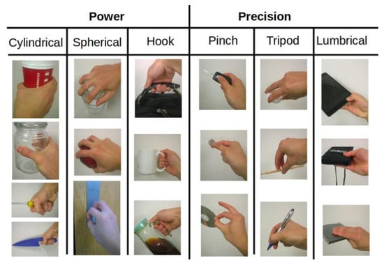- Yang, Y.; Fermüller, C.; Li, Y.; Aloimonos, Y. Grasp type revisited: A modern perspective on a classical feature for vision. In Proceedings of the IEEE Conference on Computer Vision and Pattern Recognition (CVPR), San Francisco, CA, USA, 18–20 June 2015; pp. 725–733. [Google Scholar] [CrossRef]