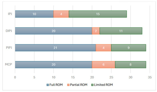 Normal values used to estimate the range of motion (ROM) are defined as follows: 0–90° for metacarpophalangeal joint (MCPJ) movement, 0–90° or 100° for proximal interphalangeal joint (PIPJ), and 0–70° for distal interphalangeal joint (DIPJ). For the thumb, cinterphalangeal joint (IPJ) movement was considered normal at 0–80°. The ability to rotate the thumb was also assessed.