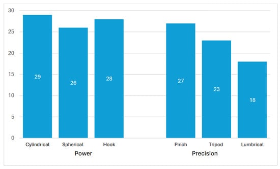 Power grasp was evaluated in 29 of the 35 models, while precision grasp was assessed in 27 prostheses. Among the grasp types, 29 models could achieve a cylindrical grasp, 26 could perform a spherical grasp, and 28 were able to perform a hook grasp. Additionally, 27 models could perform a pinch grip, 23 could achieve the tripod position, and only 18 models were able to successfully perform the lumbrical grip, the most challenging position. These findings are summarized in Figure 7.