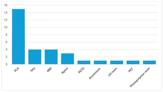 The materials used in the fabrication of 3D-printed prostheses were documented for 20 models. Polylactic acid (PLA) emerged as the most commonly utilized material, featured in 15 models, followed by thermoplastic polyurethane (TPU) and acrylonitrile butadiene styrene (ABS), each used in four models. Additional materials reported included polyethylene terephthalate glycol-modified (PETG), aluminum, nylon, UV resin, polyethylene terephthalate (PET), and photopolymer resin.