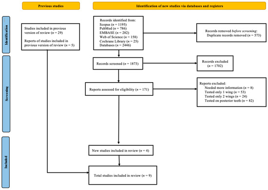 During the initial search across all databases, a total of 2446 articles were obtained. Among these, 573 duplicates were identified and subsequently removed. The screening process involved assessing titles and abstracts, resulting in the exclusion of 1702 studies that were deemed irrelevant to our research objective. After a thorough evaluation of the full texts, a total of nine studies were deemed suitable for inclusion in the meta-analysis (Figure 1). The significant characteristics and outcomes extracted from the included articles are consolidated and presented in Table 1 and Table 2. Of the nine articles, three were randomized controlled trials (RCTs) [26,27,28], two were prospective cohort studies [29,30], three were retrospective cohort studies [18,31,32], and one was a clinical trial [33]. The mean follow-up time of the included studies was 5.4 years. All studies compared at least two designs of RBFDPs and defined outcomes of failure as debonding or fracture.