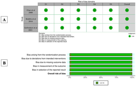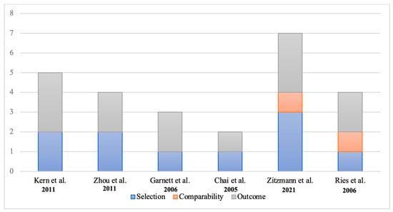 The risk of bias in the randomized controlled trial (RCT) was minimal, as the study provided comprehensive information on randomization procedures, deviations from the intended intervention, blinding, outcome measurement, and other potential sources of bias (Figure 2). In cohort studies, the Newcastle–Ottawa scores varied from 2 to 7 stars, indicating a range of bias risks from low to high. Notably, only two cohort studies detailed baseline control measures for patient selection (Figure 3).