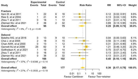 The results of the overall failure rates showed that cantilever RBFDPs [23,24,25,26,27,29,30] exhibited a lower failure rate in eight of the nine included studies. Cantilever RBFDPs exhibited significantly lower failure rates compared to two-retainer fixed–fixed RBFDPs (RR 0.36, 95% CI 0.17–0.75), as indicated in Figure 4. The heterogeneity among studies did not suggest significant variation (I2 = 27%).