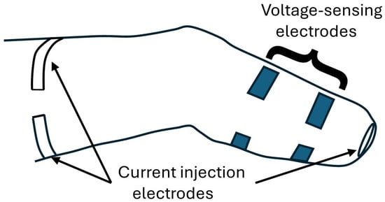 Diagram of a residual limb instrumented with electrodes ready for data collection. A proximal current injection electrode is positioned on the thigh, and two anterior voltage-sensing electrodes and two posterior voltage-sensing electrodes are placed on the residual limb. The distal current injection electrode is on the inferior aspect of the residual limb.