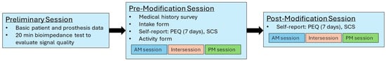 Each participant attended three test sessions: a preliminary session, a pre-modification session, and a post-modification session (Figure 2). The pre-modification session was scheduled at least two weeks after the preliminary session, and the post-modification session was completed after the participant’s socket was modified or replaced by their practitioner.