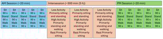 The test was in three sections: a morning structed protocol (about 20 min); an intersession semi-structured protocol (about 5 h); and an afternoon structed protocol (about 20 min) (Figure 3). During the morning and afternoon structured protocols, five cycles of sitting, standing, and walking (each activity for 90 s) were performed. Walking was performed on a treadmill at the participant’s preferred walking speed, established during the preliminary session and maintained for all treadmill tests in the study. During standing, the weight borne on the prosthetic leg was monitored with a scale to ensure equal weight-bearing was maintained. If the weight on the scale deviated by more than 5% of the participant’s body weight, then the participant was instructed by the research prosthetist to shift his or her weight to the appropriate leg to achieve equal weight-bearing. During sitting, the participant sat in a relaxed bodily position with his or her thighs horizontal, knees positioned at roughly the same level as the hips, and feet touching the floor, such that knee flexion was approximately 100 degrees.
