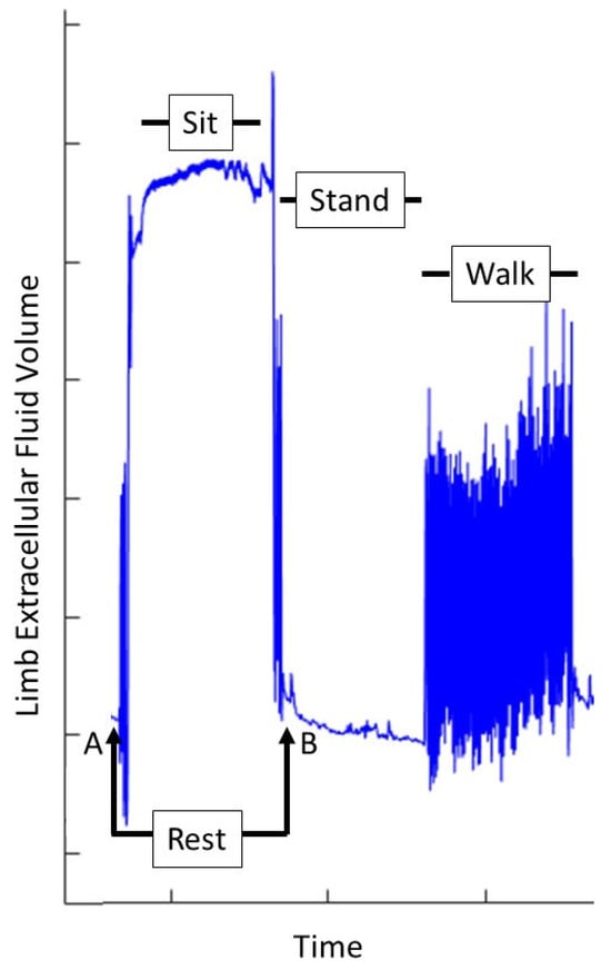 Example limb fluid volume data from one sit/stand/walk cycle during an in-laboratory test session. Sit, stand, and walk segments are shown. Rest is the difference in fluid volume during standing from before to after the sit (A–B).