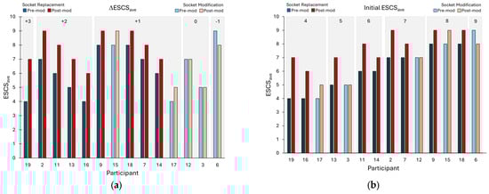 The ESCSave results, rank-ordered from most improved to least improved socket fit, are shown in Figure 5a. One participant showed a post-modification minus pre-modification score of 3 points, four showed a change of 2 points, six a change of 1 point, two showed no difference, and one a change of −1 point.